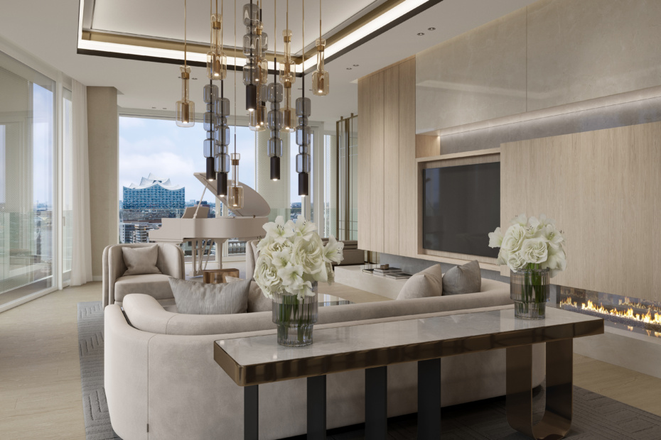 Beim 119-Quadratmeter-Apartment kann man nur von Liebe auf den ersten Blick sprechen. Bereits das helle Entree mit Gäste-Bad und integrierter Garderobe lässt Ihren Puls schneller schlagen. Doch beim Herzstück der Drei-Zimmer-Wohnung ist es um Sie geschehen: Der gigantische Wohn-/Essbereich verführt mit spektakulärem Rundum-Panorama. Hier bekommt Ihr Leben die ganz große Bühne: Ob fröhliche Kochabende mit Aussicht in der optionalen Design-Küche, Lesen und Entspannen im Salon oder blaue Stunden auf der privaten Terrasse.