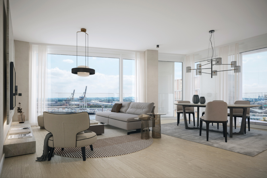 Bodentiefe Fenster geben den Blick auf Wolken, Hafen und Stadt frei. Die weitläufigen Räumlichkeiten bieten die besten Voraussetzungen für individuelle Gestaltungsmöglichkeiten: vom multifunktionalen Mikroapartment bis hin zum mehrstöckigen Penthouse mit loft-artigen Flächen und Dachterrasse. Verschaffen Sie sich hier einen Überblick über die vielfältigen Wohnungstypen in diesem einzigartigen Wohnturm.