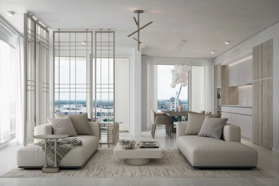 Im zwölften Stock trägt man den Kopf immer ein wenig in den Wolken. Dafür sorgt die atemberaubende Aussicht aus jedem einzelnen der riesigen, bodentiefen Fenster. Und die 18 m² große Loggia mit viel Platz für Ihre Loungemöbel. Da kann man fast vergessen, wie begeistert man auch vom Rest der künftigen Traumwohnung ist! Zum Beispiel vom 32-Quadratmeter-Wohn-/Essbereich mit maßgefertigter Designküche (optional), die in Farbe und Material perfekt zum übrigen Interior passt.